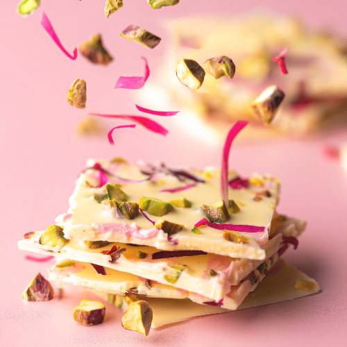 A delight from the Persian Peninsula, this one hits the exotic bend. It’s white chocolate that is fragrant with creamy slivers that are pretty with rose petals and crushed pistachio.